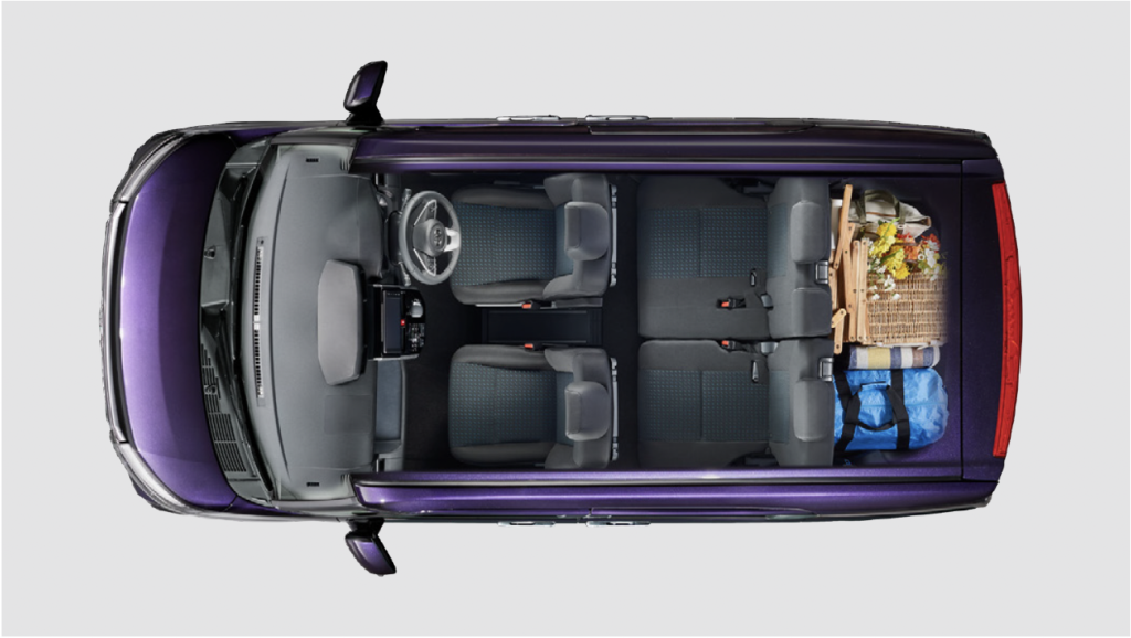 ルーミーの室内空間は、長さ2,180mm×幅1,480mm×高さ1,355mm。運転席・後部座席ともに前後240mmのスライドが可能です。後部座席は、6:4分割可倒式。ダイブイン機構で前方に格納すればフルフラットな荷室空間が出現し、長尺物の荷物なども収容できます。また、子どもが立てるほどの室内高も、室内空間にゆとりをもたらす特筆すべき要因となっています。